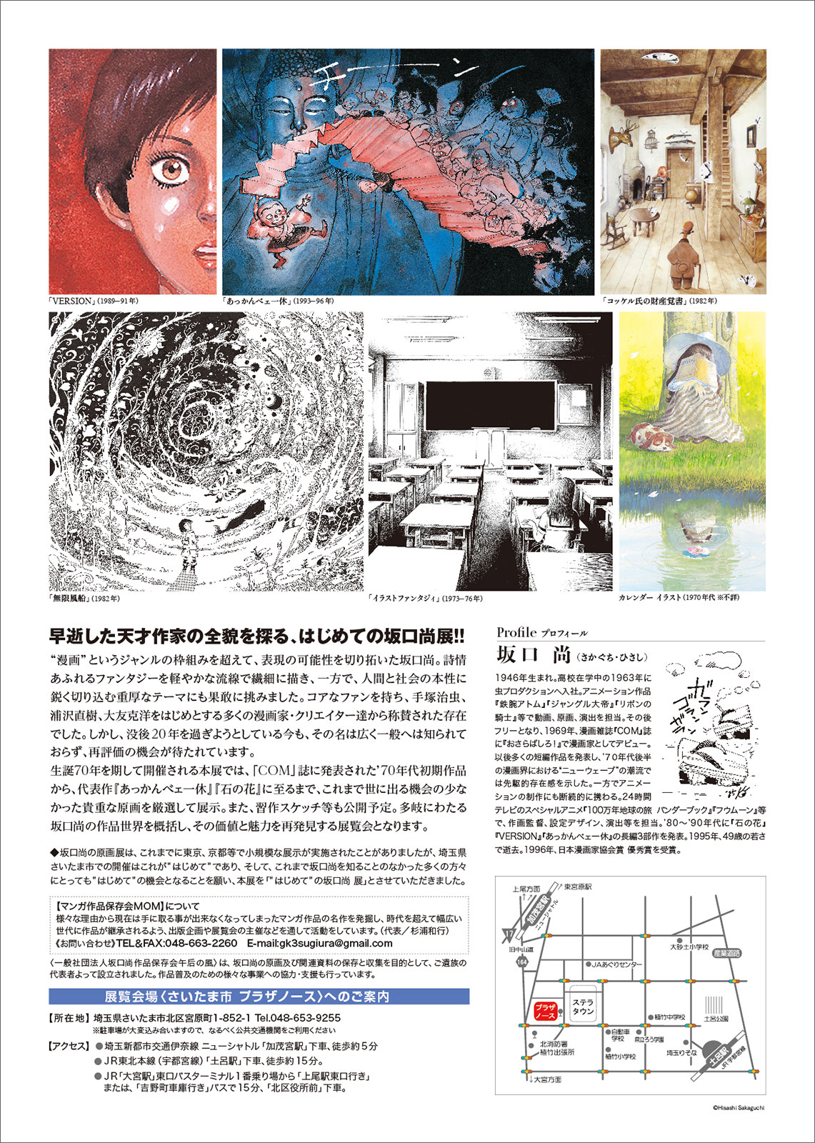 坂口尚生誕70年を期して〈MOM〉が企画したこの展覧会では、「COM」誌に発表された’70年代初期作品から、代表作『石の花』『あっかんべェ一休』に至るまで、これまで世に出る機会の少なかった貴重な原画、習作スケッチ等を厳選して展示。多岐にわたる坂口尚の作品世界を概括し、その価値と魅力を再発見する機会となりました。